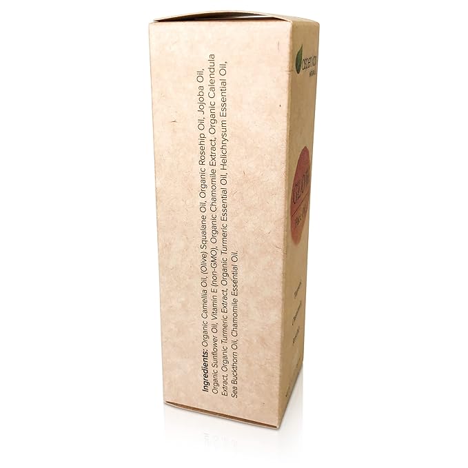 - WITH ORGANIC ROSEHIP SEED OIL AND ORGANIC TURMERIC OIL Made with organic unrefined Rosehip seed oil, organic camellia seed oil, organic turmeric essential oil, organic chamomile, organic calendula, Sea buckthorn oil, Jojoba oil and Helichrysum essential oil