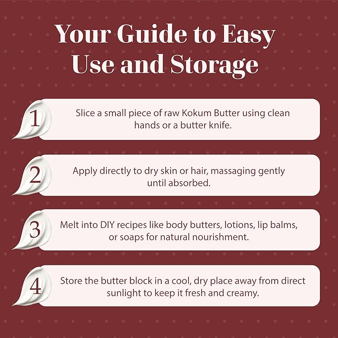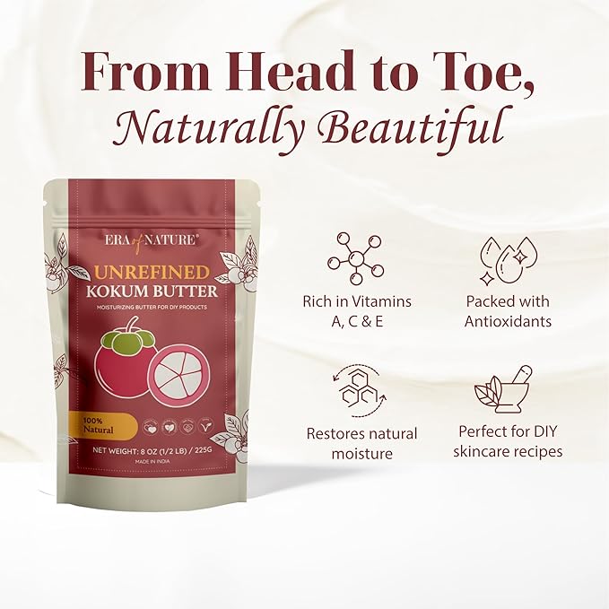 - RAW AND UNREFINED KOKUM BUTTER: era of nature kokum butter is 100% pure, firm, and scent-free—ideal for blending with raw shea butter or cocoa butter. A favorite for those creating belly butters, stretch mark creams, and deeply moisturizing body products.