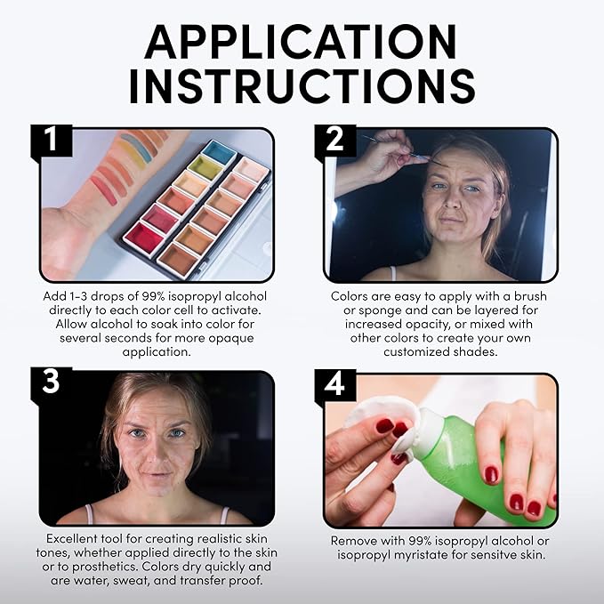 - Product Benefits : Highly pigmented, alcohol-activated makeup palette for realistic SFX and tattoo coverage, suitable for various skin tones Highly pigmented, alcohol-activated makeup palette for realistic SFX and tattoo coverage, suitable for various skin tones