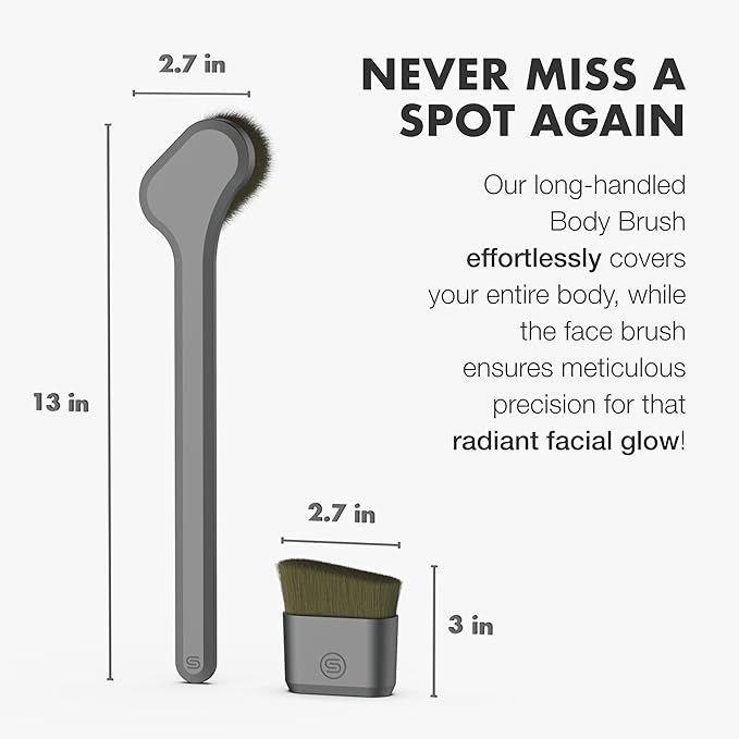 - Long Handle for Full-Body and Back Coverage: Never miss a spot again. Our body brush comes with a long handle, specifically designed to help you apply self-tanner to your back and other hard-to-reach areas. Say goodbye to awkward tanning gloves and hello to complete, sun-kissed body coverage.