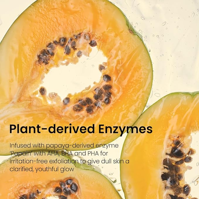 - AHA, BHA, PHA & PAPAIN: Salicylic acid, Glycolic acid, Lactic acid and Papain enzyme, derived from Papaya Fruit, exfoliate dead skin and polishes skin texture, leaving it feeling softer, smoother and more supple.