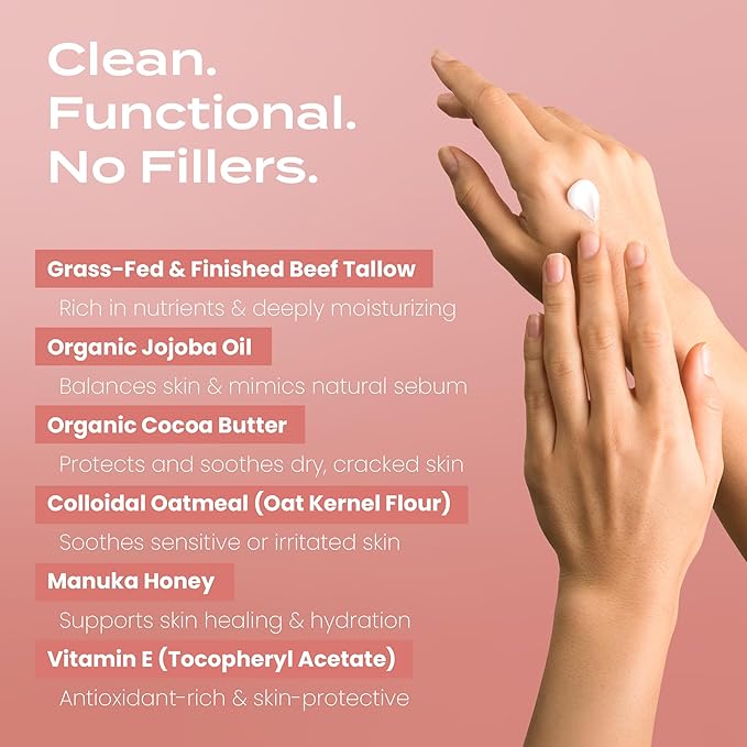 - Beef Tallow Balm With Manuka Honey: Formulated for women and men, our beef tallow balm is enriched with Manuka honey to deliver hydration and healing. This unique blend locks in moisture, soothes dry cracked skin, and supports the skin barrier.